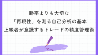 上級者勝率よりも大切な「再現性」を測る自己分析の基本|上級者が意識するトレードの精度管理術 勝率だけを見ていませんか?本当に見るべきは“再現性” 多くの中級者トレーダーが抱える共通の勘違い。それは、「勝率が高い=うまいトレーダー」という思い込みです。 しかし上級者は、勝率よりも再現性(=安定して同じ結果を出せるか)を... 2025.10.31上級者