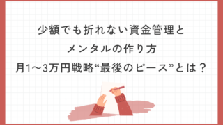女性・副業少額でも折れない資金管理とメンタルの作り方|月1〜3万円戦略“最後のピース”とは? ◆ 月1〜3万円が安定しない人に“足りないもの” ここまで、 無理しない設計 現実的な回数と勝率 女性・副業向けの考え方 をお伝えしてきました。 でも実は、多くの人が月1万円に届かない理由があります... 2026.02.20女性・副業