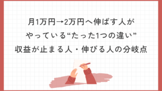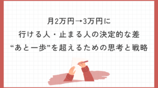 女性・副業月2万円→3万円に行ける人・止まる人の決定的な差|“あと一歩”を超えるための思考と戦略 ◆ 月2万円の壁は「見えない壁」 月1万円を安定させ、月2万円に届いてくると感じるのがこれ。 伸びてきた実感はある でも3万円が遠い 調子いい月だけ届く 安定しない ここで止まる人は非常に多いです。... 2026.04.14女性・副業