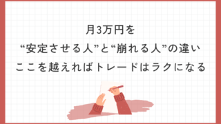 女性・副業月3万円を“安定させる人”と“崩れる人”の違い|ここを越えればトレードはラクになる ◆ 月3万円は“到達”より“維持”が難しい 月3万円に届いたとき、多くの人がこう感じます。 「やっとここまで来た」 「このまま増やせそう」 「少し自信がついてきた」 でも実はここが、一番崩れやすいポイント... 2026.04.19女性・副業