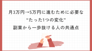 女性・副業月3万円→5万円に進むために必要な“たった1つの変化”|副業から一歩抜ける人の共通点 ◆ 月3万円の次に来る“見えない壁” 月3万円を安定できるようになると、多くの人がこう思います。 「次は5万円いけそう」 「もう少し増やしたい」 「ここから伸ばしたい」 でもここで、多くの人が止まります。... 2026.04.25女性・副業